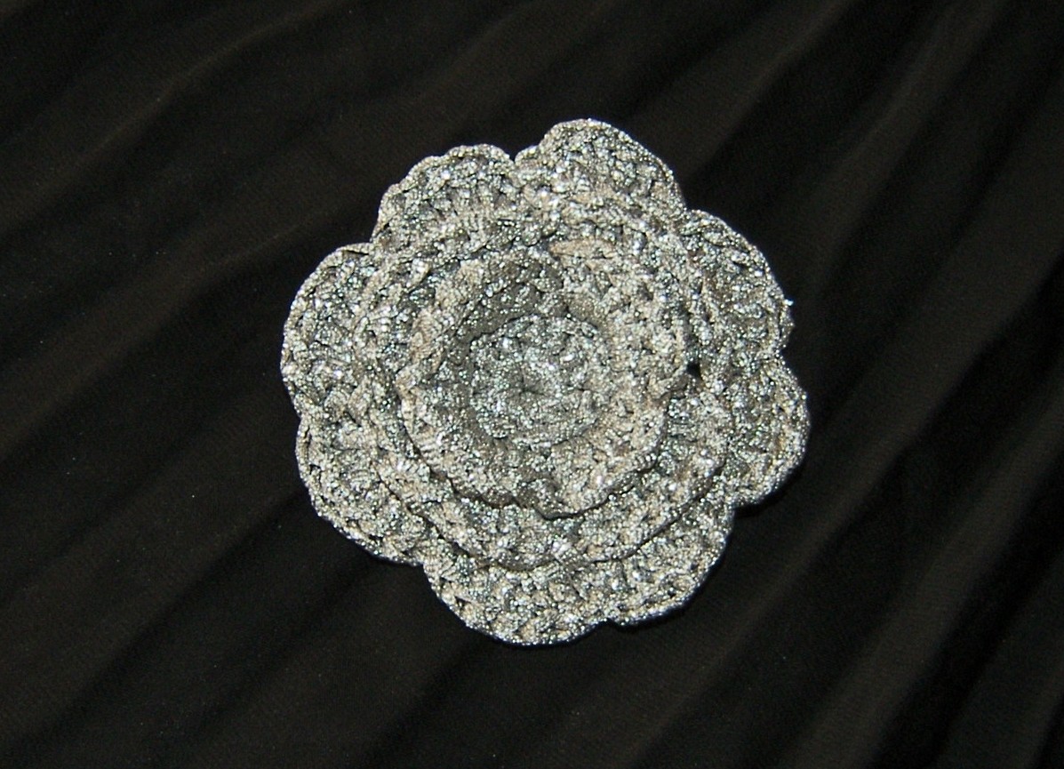 Flor de ganchillo con cinta de plata de la calidad VANITY, con 3 capas de pétalos que le dan relieve.